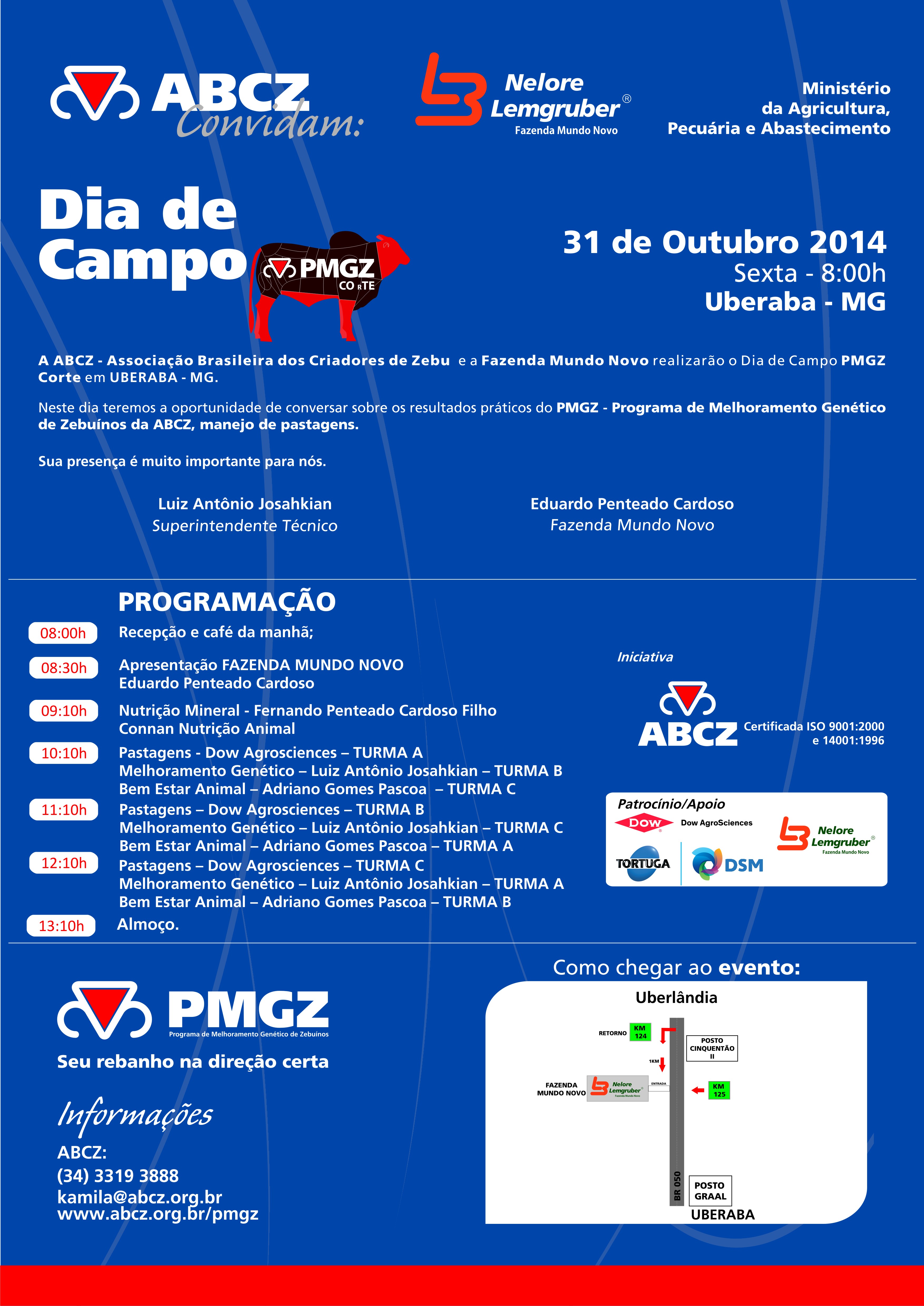 A Fazenda Mundo Novo sedia nesta sexta-feira (31/10), em parceria com a ABCZ, o "Dia de Campo PMGZ Corte". Durante o evento, será apresentado o novo formato e as aplicações práticas do PMGZ – Programa de Melhoramento Genético de Zebuínos da ABCZ. A programação de palestras também contempla temas relacionados ao manejo de pastagens, bem estar animal e nutrição. O Dia de Campo é aberto ao público e está marcado para começar às 8h. A entrada da Fazenda Mundo novo fica na BR 050, KM 125 sentido Uberlândia-Uberaba.