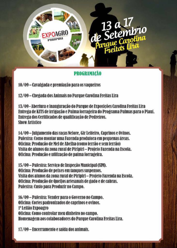 Os próximos dias prometem ser de bons negócios para os selecionadores da região do Piauí. A cidade de Piripiri será palco da Expoagro Piripiri, exposição que começou hoje (13/09) e segue até domingo, no parque Carolina Freitas Lira, em Piripiri.