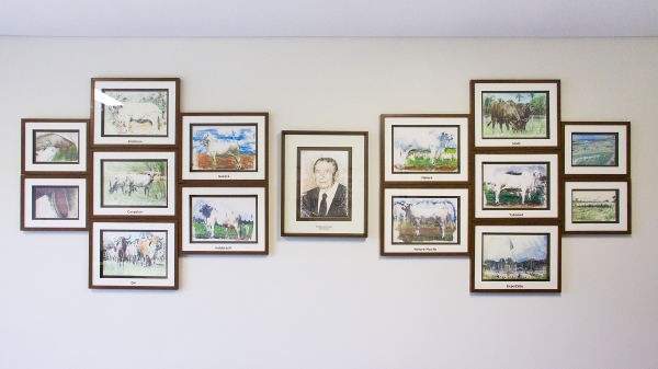 “Nosso objetivo foi retratar todos os meandros que trabalhamos na Associação, desde as raças até o grande rebanho de produção. Esse conjunto foi feito especificamente para a sala, com uma técnica mista em aquarela, pastel e lápis de cor”, explica Lemos.