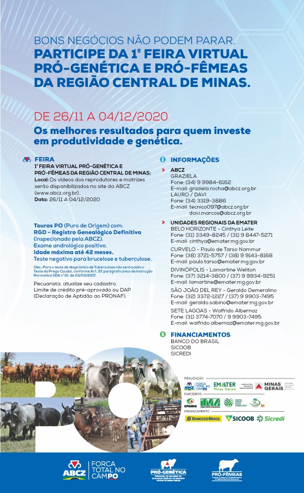 Em Minas Gerais já foram realizadas três feiras virtuais nas regiões do Triângulo Mineiro, Vales Jequitinhonha e Mucuri e Sul de Minas, possibilitando a venda de cerca de 50 animais melhoradores, aumentando a produtividade e rentabilidade dos produtores rurais em todo o Estado. “Com as feiras virtuais, a ABCZ tem oportunizado que todos os associados participem ofertando seus animais. Olhando pelo lado dos compradores, temos uma maior oferta que certamente possibilitará a aquisição dos animais por um melhor custo-benefício”, destaca Rivaldo Machado Borges Júnior, presidente da ABCZ.