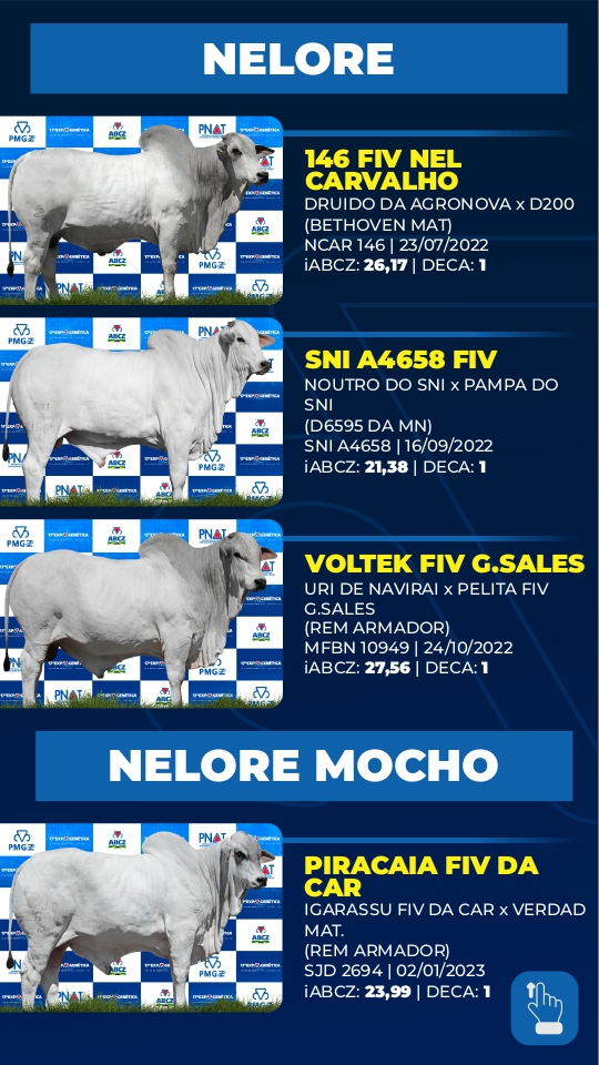 Restam poucas doses de sêmen dos touros classificados no PNAT 2024 (Programa Nacional de Avaliação de Touros Jovens), promovido pela ABCZ durante a 17ª ExpoGenética, em agosto deste ano.  A ABCZ divulgou uma lista dos reprodutores que ainda possuem doses disponíveis. Confira: