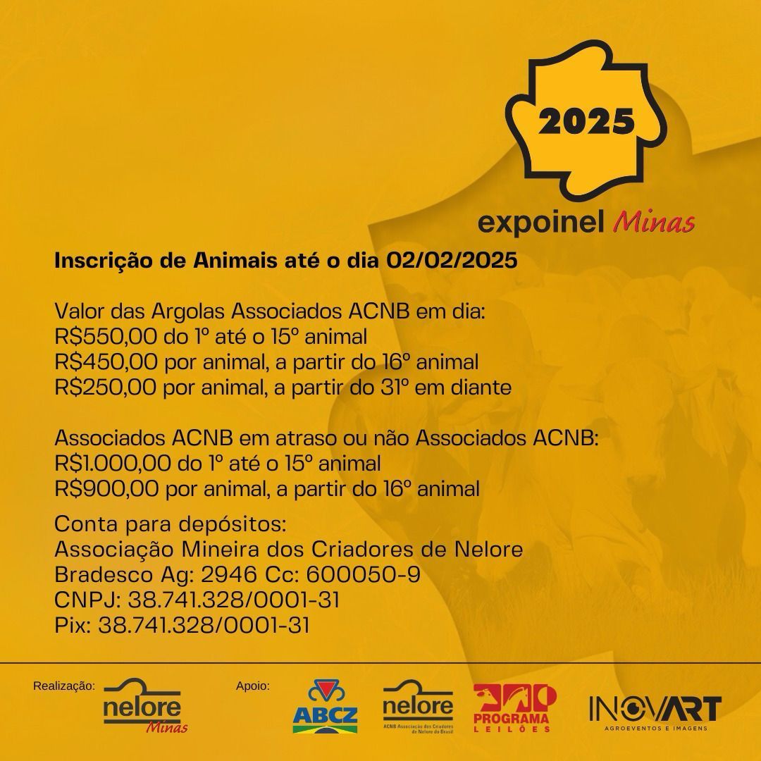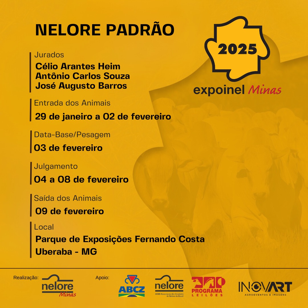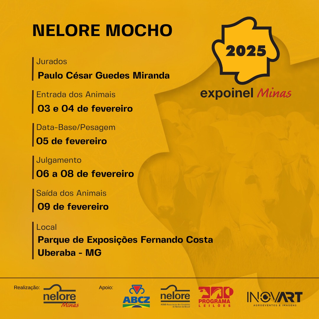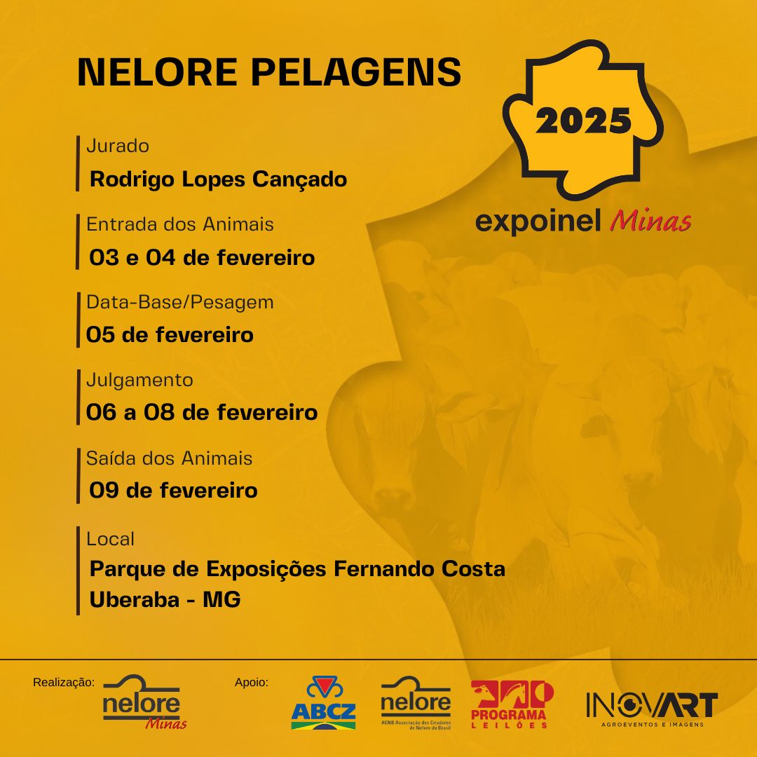Mais uma vez, a Expoinel Minas abrirá o calendário anual de exposições no Parque Fernando Costa, em Uberaba (MG). A feira acontecerá de 29 de janeiro a 9 de fevereiro, com julgamentos de Nelore Padrão, Nelore Pelagens e Nelore Mocho. As inscrições de animais vão até o dia 2 de fevereiro. Para mais informações, entre em contato com a Nelore Minas.