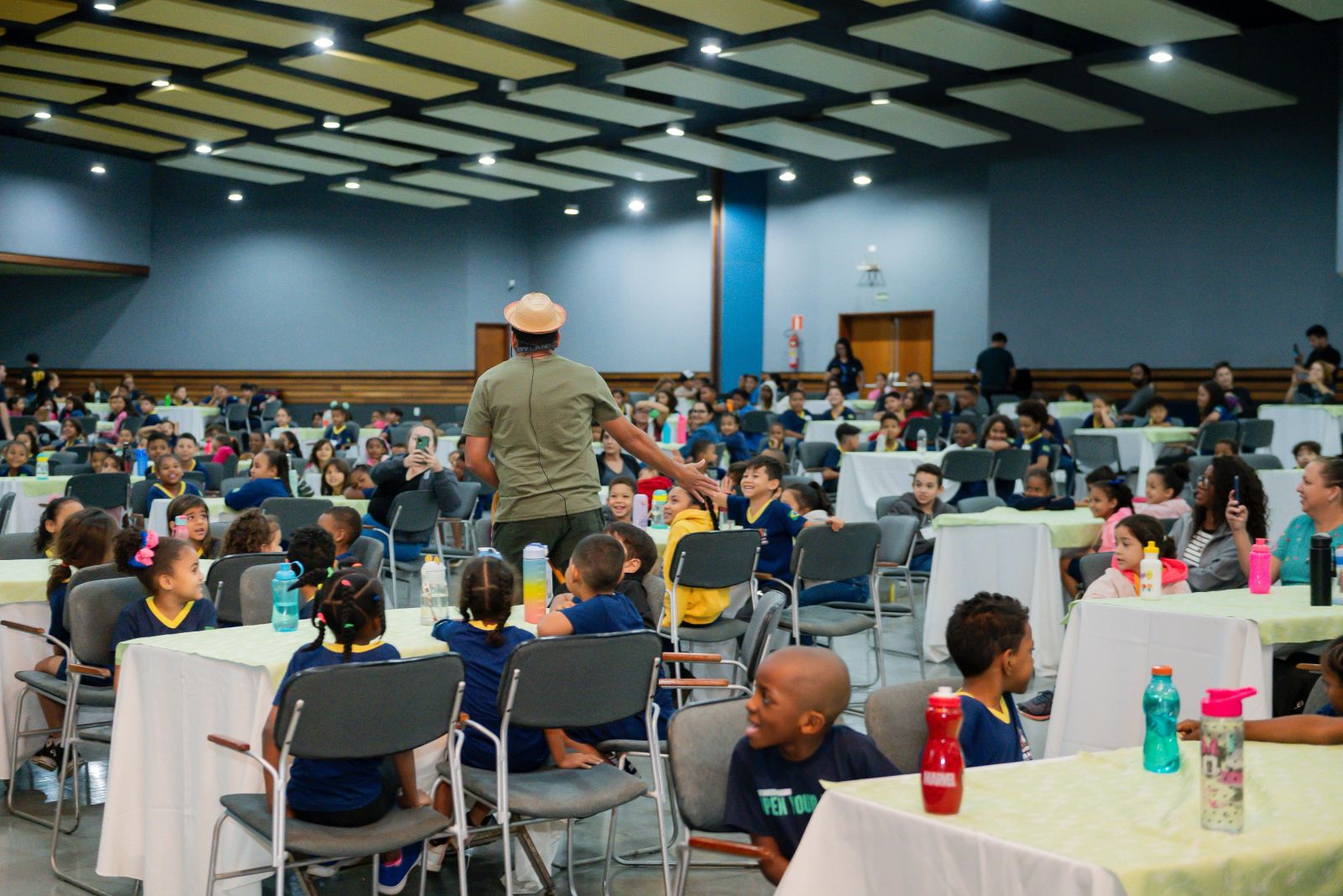 Com humor e imaginação, os atores conduziram uma verdadeira viagem no tempo, explorando os desafios da humanidade em diferentes épocas. “É um espaço diferente, onde eles estão aprendendo e interagindo de forma lúdica. É como uma aula, mas em outro formato, que desperta ainda mais a curiosidade”, reforça a professora Tânia Lúcia de Carvalho, da Escola Municipal Professora Terezinha Hueb de Menezes.