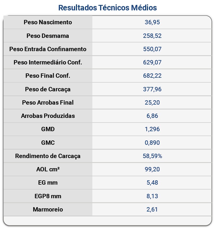 Com apenas 22 meses de idade, os animais apresentaram peso final de confinamento de 682,22 kg, carcaça de 377,96 kg e 25,20 arrobas, resultado considerado acima da média dos frigoríficos. O rendimento de carcaça de 58,59% reforça a eficiência produtiva, enquanto os indicadores de qualidade confirmam a superioridade genética e zootécnica.