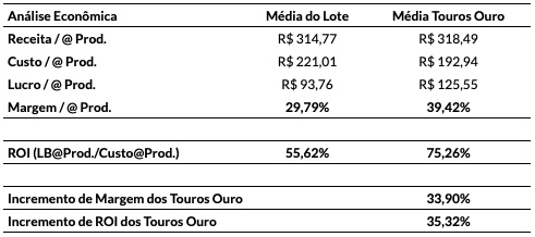 Em termos percentuais, a Margem sobre a Arroba Produzida saltou de 29,79% (Lote Total) para 39,42% (Touros Ouro).