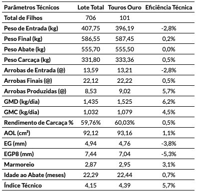 Da mesma forma, o Ganho Médio de Carcaça (GMC) foi 4,5% maior no grupo Ouro (1,079 kg/dia) contra 1,032 kg/dia do lote total.